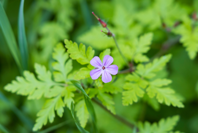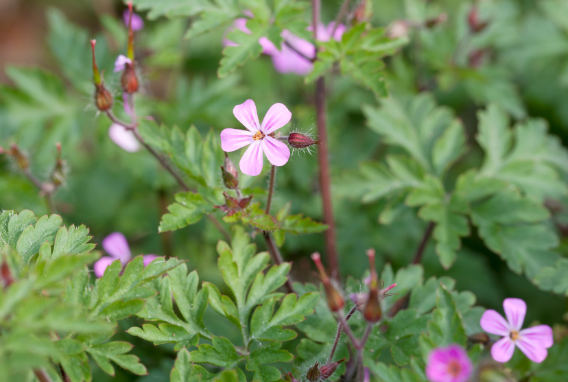 Robertskruid, ook wel bekend als stinkende Ooievaarsbek of Geranium Robertianum, is te herkennen aan de roze bloemetjes. Je vindt deze plant veel in open bossen, bos- en struweelranden, of op/tegen muren.